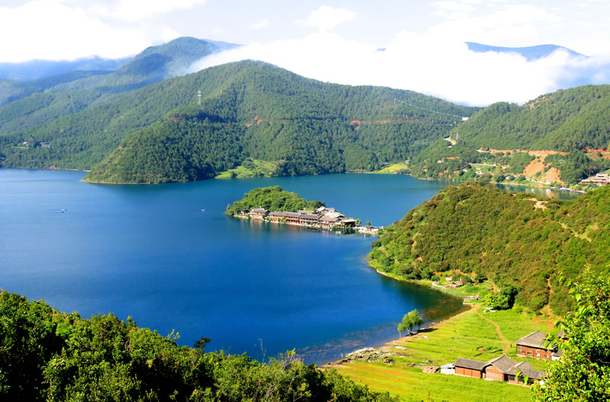 麗江瀘沽湖摩梭文化旅游區(qū),地處麗江市寧蒗縣永寧鄉(xiāng)與四川省鹽源縣左所鄉(xiāng)交界處,是摩梭族人的主要聚居地,素有“高原明珠”之稱,是云南省九大高原湖泊之一。行政區(qū)劃上,瀘沽湖隸屬四川省鹽源縣和云南省寧蒗縣共同管轄,其中四川省鹽源縣管轄東部的29.6平方千米(含沼澤濕地5.8平方千米),云南省寧蒗縣管轄西部的27.0平方千米。瀘沽湖,在地貌區(qū)劃上屬橫斷山系切割山地峽谷區(qū),橫斷山北段高山峽谷亞區(qū)和滇東盆地山原區(qū),滇西北中山山源亞區(qū)交界地帶。瀘沽湖湖岸多彎曲,形成深淵的小港灣,湖中有大小島嶼七個,都是石灰?guī)r殘丘。沿湖東部湖底有長形深槽,北部和長島兩側(cè)的湖坡陡峻。湖北面有獅子山,東北面有肖家火山,西南為狗鉆洞山地。