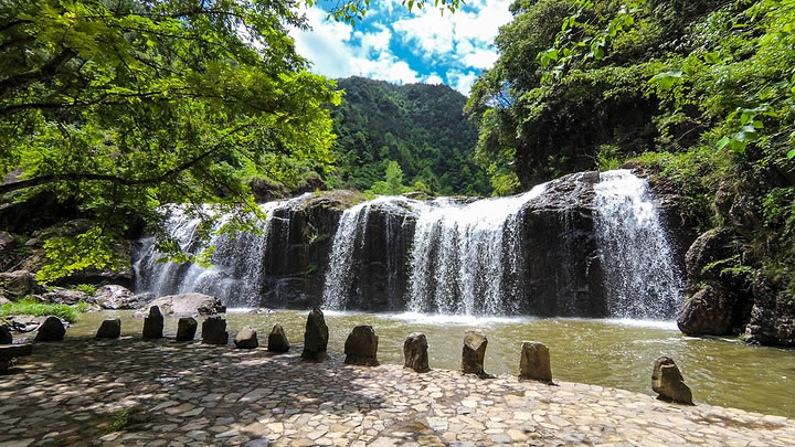 - 漂流區(qū):2公里長、落差50多米的皮筏艇漂流,河道迂回曲折,設(shè)巨巖灘潭,體驗(yàn)“舟到巖前疑無路”的刺激。