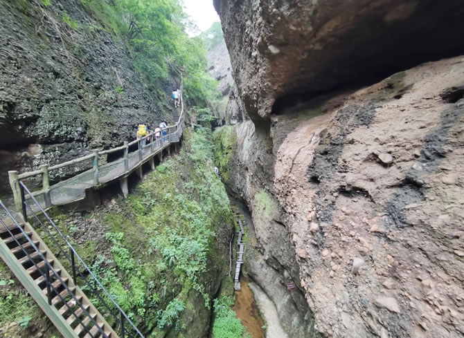 - 一線天:峽谷最窄處僅60厘米,頂部巖縫透入陽光,形成光影交錯的神秘通道,需側(cè)身通過,全程設防滑石階與安全扶手。