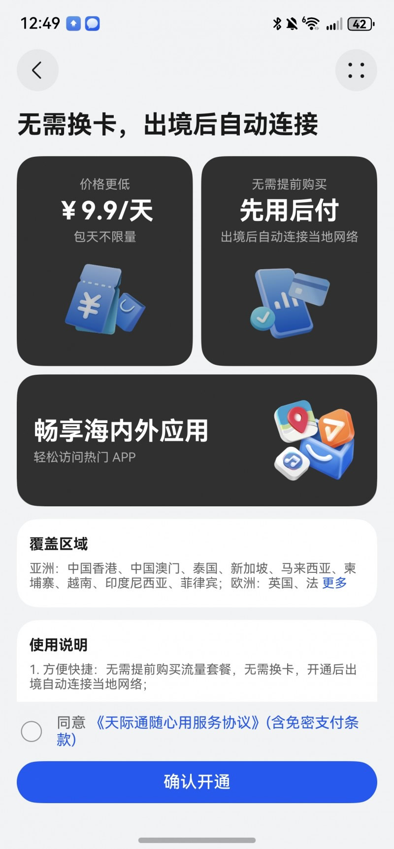 緊接著,天際通第二重禮·隨心用——9.9元/天多地流量隨心用,針對多地旅行或深度游用戶,天際通推出「9.9元/天多地流量隨心用」服務,用戶無需換卡,支持先用后付,按需付費。每24小時僅需9.9元,享5GB高速流量+常速不限量,覆蓋歐美、東南亞等50個熱門地區(qū);單次開通長期有效,不用不扣費,聯(lián)程轉機無縫銜接。