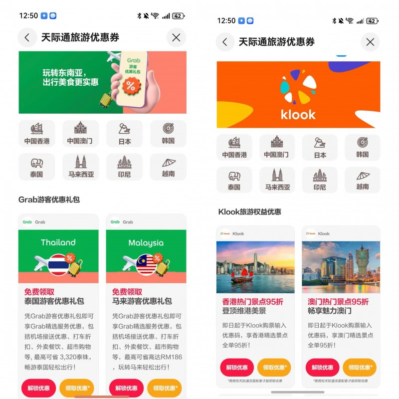 天際通「十月暢行月」第四重禮·領權益,天際通聯(lián)合全球合作伙伴,為用戶提供超值旅游權益包,覆蓋Grab打車、Klook景點門票、酒店餐飲等場景,在馬來西亞、泰國、歐洲等地均可享受出境專屬折扣。
