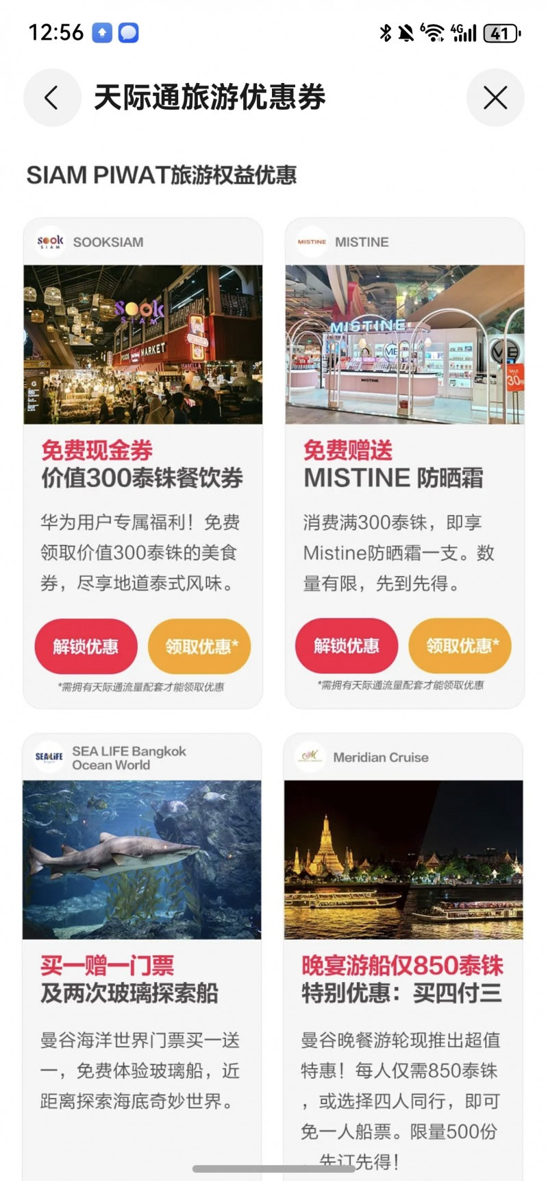 華為手機用戶開啟天際通流量后,可以在泰國、馬來西亞、越南、印尼免費領取Grab游客優(yōu)惠禮包,憑Grab優(yōu)惠禮包即可享受精選服務,包括機場接送、打車折扣、外賣餐飲、超市購物等出游場景,輕松暢游東南亞。還可領取Klook旅游權益優(yōu)惠,無論您是在中國香港&澳門暢游看夜景,還是在日本觀賞和風之美,在韓國感受韓風潮流、越南邂逅燈火古鎮(zhèn),即可享受景點購票全單95折優(yōu)惠。在活動頁還可領取朗廷卓逸會全球酒店住宿禮遇及專屬優(yōu)惠房價,共覆蓋全球超過30家知名酒店。