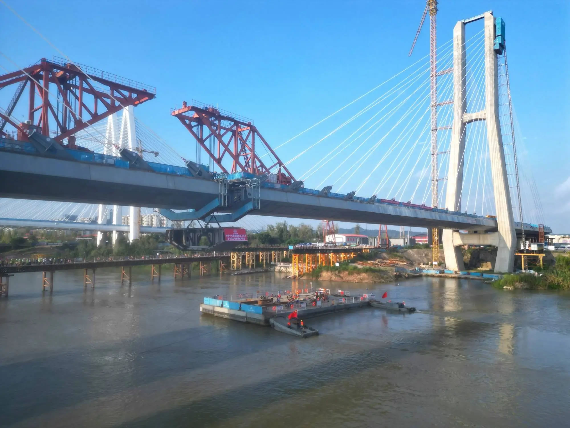 據(jù)中鐵十七局成達萬高鐵項目二工區(qū)總工程師單立國介紹,由于大橋橫跨涪江,施工團隊創(chuàng)新采用“浮運+橋面吊裝”方案,先將鋼箱梁通過浮箱從碼頭運輸至江心指定位置,再運用150噸橋面吊機進行精準提升。為確保合龍精準可控,項目團隊提前謀劃、周密部署。針對大跨度斜拉橋合龍段受力復(fù)雜、溫度變形敏感、精度控制要求高等技術(shù)難點,團隊選擇夜間“溫度低、溫差小”時段進行合龍,有效減少溫度變化引起的結(jié)構(gòu)變形,并通過線形監(jiān)控、勁性鎖定等關(guān)鍵技術(shù)措施,最終將線形精度控制在毫米級范圍,實現(xiàn)高質(zhì)量合龍。