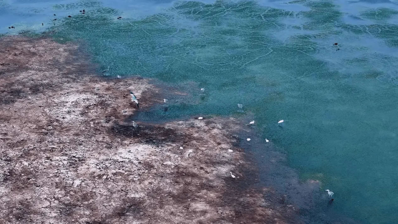 陽光灑落時,湖水清澈見底,魚兒在水中自在游弋,與岸邊景致構(gòu)成絕佳畫面。此外,黑翅長腳鷸也不時現(xiàn)身灘涂,為這幅生態(tài)圖景再添一抹靈動色彩。