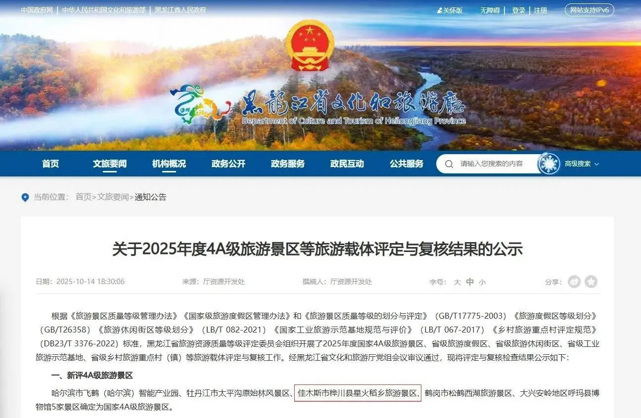 近日,黑龍江省文化和旅游廳發(fā)布2025年度AAAA級旅游景區(qū)評定與復核結(jié)果公示,樺川縣星火稻鄉(xiāng)旅游景區(qū)成功躋身國家AAAA級旅游景區(qū)行列。