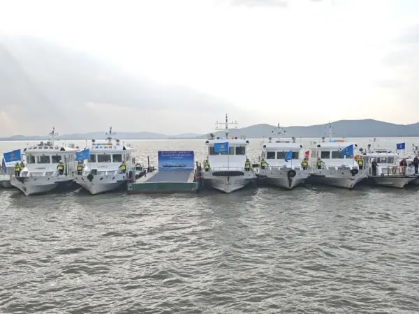 本次演練以“實(shí)戰(zhàn)導(dǎo)向、效果為先”為原則,模擬船舶碰撞、人員落水等極端場(chǎng)景,共分為旅游船舶開(kāi)航前自查、旅游船舶環(huán)太湖聯(lián)動(dòng)動(dòng)態(tài)監(jiān)測(cè)、極端天氣旅游船舶應(yīng)對(duì)處置、旅游船舶險(xiǎn)情處置、人員落水應(yīng)急處置5個(gè)科目。其中,旅游船舶開(kāi)航前自查科目中,對(duì)照《中國(guó)籍船舶開(kāi)航前自查清單》嚴(yán)格開(kāi)展自查工作,確保船舶適航、人員適配,保證航行安全。環(huán)太湖旅游船舶聯(lián)動(dòng)動(dòng)態(tài)監(jiān)測(cè)科目驗(yàn)證了現(xiàn)有監(jiān)控系統(tǒng)對(duì)湖區(qū)船舶的精準(zhǔn)感知與實(shí)時(shí)管控能力,檢驗(yàn)了跨區(qū)域多部門(mén)協(xié)同響應(yīng)機(jī)制的可行性與高效性。極端天氣旅游船舶應(yīng)對(duì)處置科目模擬旅游船舶航行途中遭遇極端天氣,“蘇交執(zhí)法錫039”輪、“湖州執(zhí)法艇浙交巡0328”輪迅速進(jìn)入伴航狀態(tài),與游船配合形成“兩艇護(hù)一船”的防護(hù)陣形,全程護(hù)航,實(shí)時(shí)監(jiān)測(cè)周邊水域動(dòng)態(tài)、規(guī)避潛在風(fēng)險(xiǎn),主動(dòng)提供必要的航行協(xié)助。旅游船舶險(xiǎn)情處置科目充分展示旅游船舶在航行過(guò)程中突發(fā)極端天氣的全過(guò)程應(yīng)對(duì)處置,包括預(yù)警接收、封航、應(yīng)急避險(xiǎn)、協(xié)同數(shù)援、人員轉(zhuǎn)運(yùn)。人員落水應(yīng)急處置科目中,應(yīng)用無(wú)人機(jī)、遙控救生機(jī)器人新型智能裝備與數(shù)字化技術(shù),為最大限度挽救生命提供堅(jiān)實(shí)保障。
