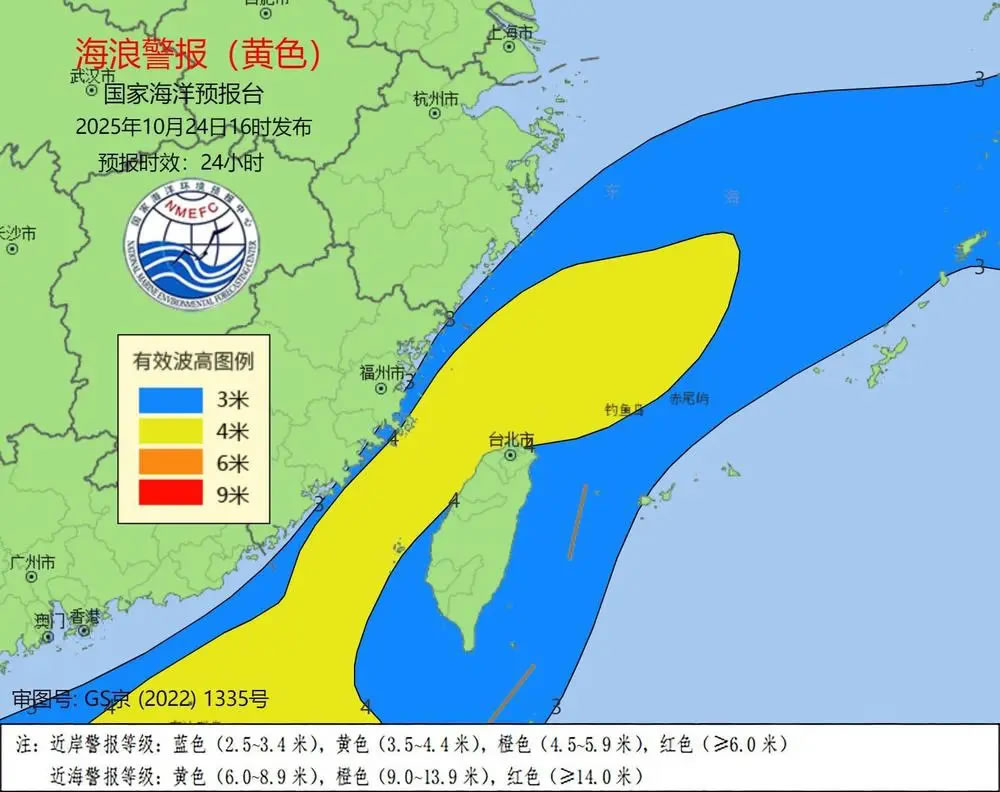 受強(qiáng)冷空氣的影響,預(yù)計(jì)10月24日下午到25日下午,東海南部、臺(tái)灣海峽將出現(xiàn)3米到5米的大浪到巨浪;福建近岸海域?qū)⒊霈F(xiàn)2.5米到3.8米的大浪,該近岸海域海浪預(yù)警級(jí)別為黃色,浙江南部近岸海域?qū)⒊霈F(xiàn)2米到3米的中浪到大浪,該近岸海域海浪預(yù)警級(jí)別為藍(lán)色。