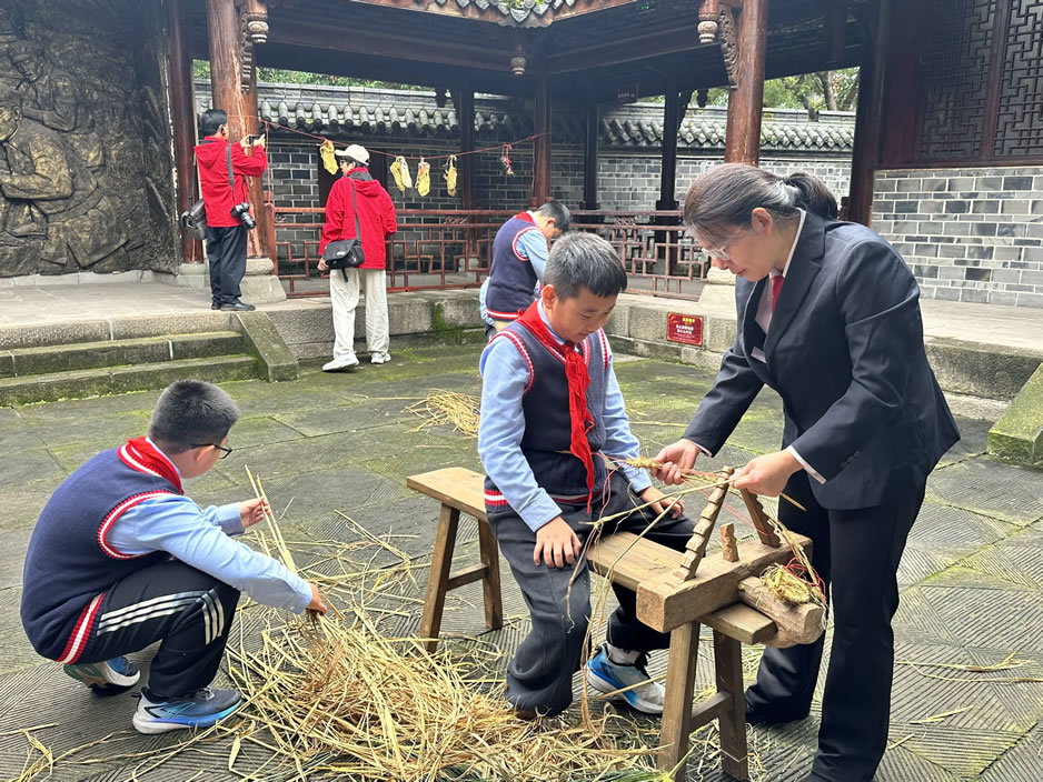 “先揉搓,再加稻草擰成一股,把尾部扎緊,交叉起來慢慢編織。”在紀念館旁的一片空地上,幾個木架旁站滿了人,指導(dǎo)老師正在給劉瑞龍紅軍小學(xué)的學(xué)生講解編織紅軍草鞋的方法。