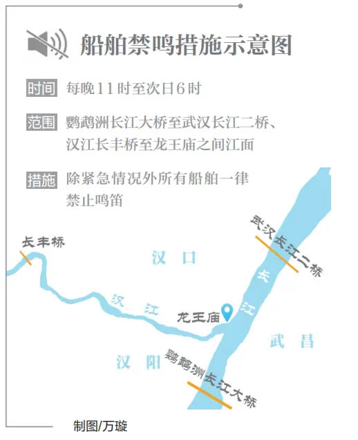 生態(tài)長江的底色愈加深厚。近日,武漢市首次在限定水域?qū)嵤┐耙归g噪聲管控。每晚11時(shí)至次日6時(shí),武漢市鸚鵡洲長江大橋至武漢長江二橋、漢江長豐橋至龍王廟之間,總長約20公里的江面進(jìn)入“靜音模式”,除緊急情況外所有船舶一律禁止鳴笛,為兩岸群眾營造優(yōu)質(zhì)夜間休息環(huán)境。